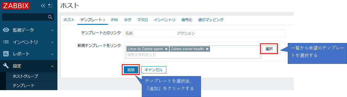 とりあえず「Linux by Zabbix agent」「Zabbix server health」の二つを選択してみました。